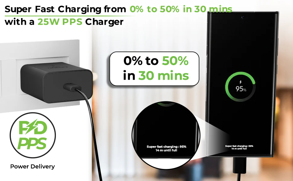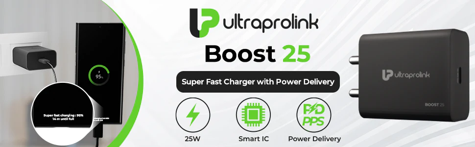 UltraProlink Boost 25, powers up your flagship devices with the high-performance 25W PPS Charger, engineered for Samsung, Nothing, and Google Pixel smartphones. Supporting multiple fast-charging protocols including the latest FAST CHARGING protocols, it smartly adapts from 20W to 25W range of power ouputs as its with built-in Smart IC technology. Proudly Designed, Developed, and Made in India, this charger offers multi-layer safety protection and operates across a wide AC voltage range (100V–270V). Backed by a 6-month brand replacement warranty for complete peace of mind.