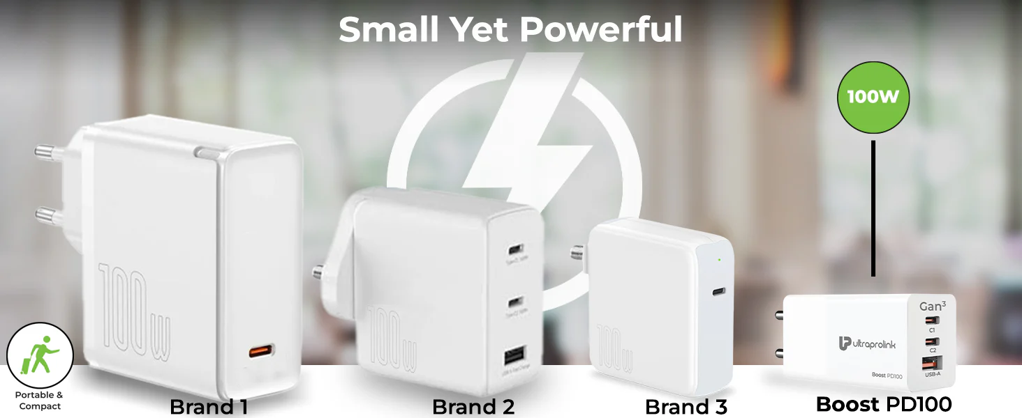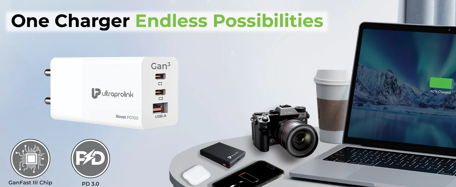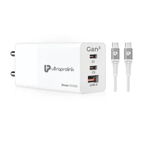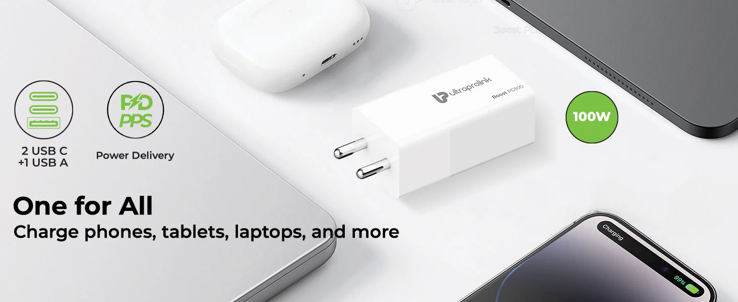 The UltraProlink Boost  100W GaN PD-PPS Charger offers outstanding performance and effective power distribution with its GaN fast III chipset. GaN tech allows it be compact yet high powered. It can connect 3 devices at once, including laptops, tablets, and smartphones with its 2 Type-C connections  and 1 USB-A ports. It guarantees dependable and secure charging with its four layers of safety protection. It makes charging setup easier and is compatible with a variety of devices, including the MacBook Pro, iPad, iPhone 16/15, Galaxy S24, and more. includes instruction card, 100W / 1.5m Nylon braided cable with metal connectors USB C-C cable, and the main charger unit.