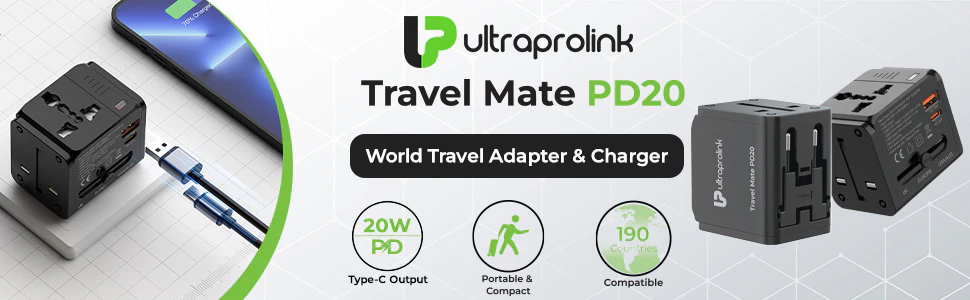 Introducing the UltraProlink Travel Mate PD20, the essential worldwide universal travel adapter equipped with a powerful 20W QC-PD charger. This travel-ready adapter features a robust set of connections including 1 USB-A and 1 Type C port, with the Type C PD delivering up to 20W, ideal for charging smart phones & tablets. Designed to connect seamlessly in over 190 countries. It is BIS certified, ensuring top-notch quality and safety for use both in India and abroad, with an in-built safety shutter. Despite its high power capacity supporting a voltage range from 100V to 250V and up to 1500W, it is compact and lightweight (100g), making it an easy fit in your handbag or travel pack. Note that it is not a voltage converter and should not be used with large home appliances. The Travel Mate PD20 comes with a 6-month manufacturer’s warranty for peace of mind. Equip yourself with the Travel Mate PD20 and stay powered and connected, no matter where your travels take you.