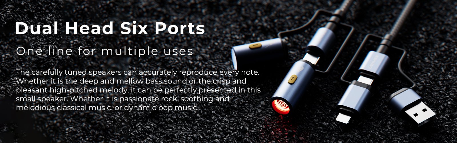 LC112 offers six ports including Type-C to C, Type-C to Torch, Type-C to Lighter, Type-C to Lightning, USB to Type-C, USB to Torch or USB to Lighter output combinations.