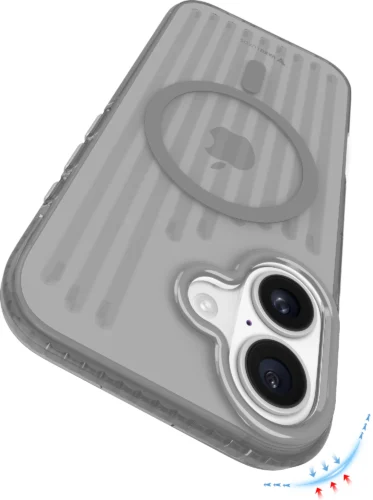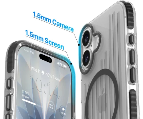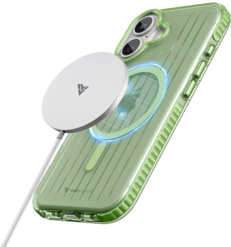This Vaku Luxos case features a vertical line pattern with a smooth, glossy finish. Its clear design lets your iPhone’s original look shine through while adding a stylish touch.