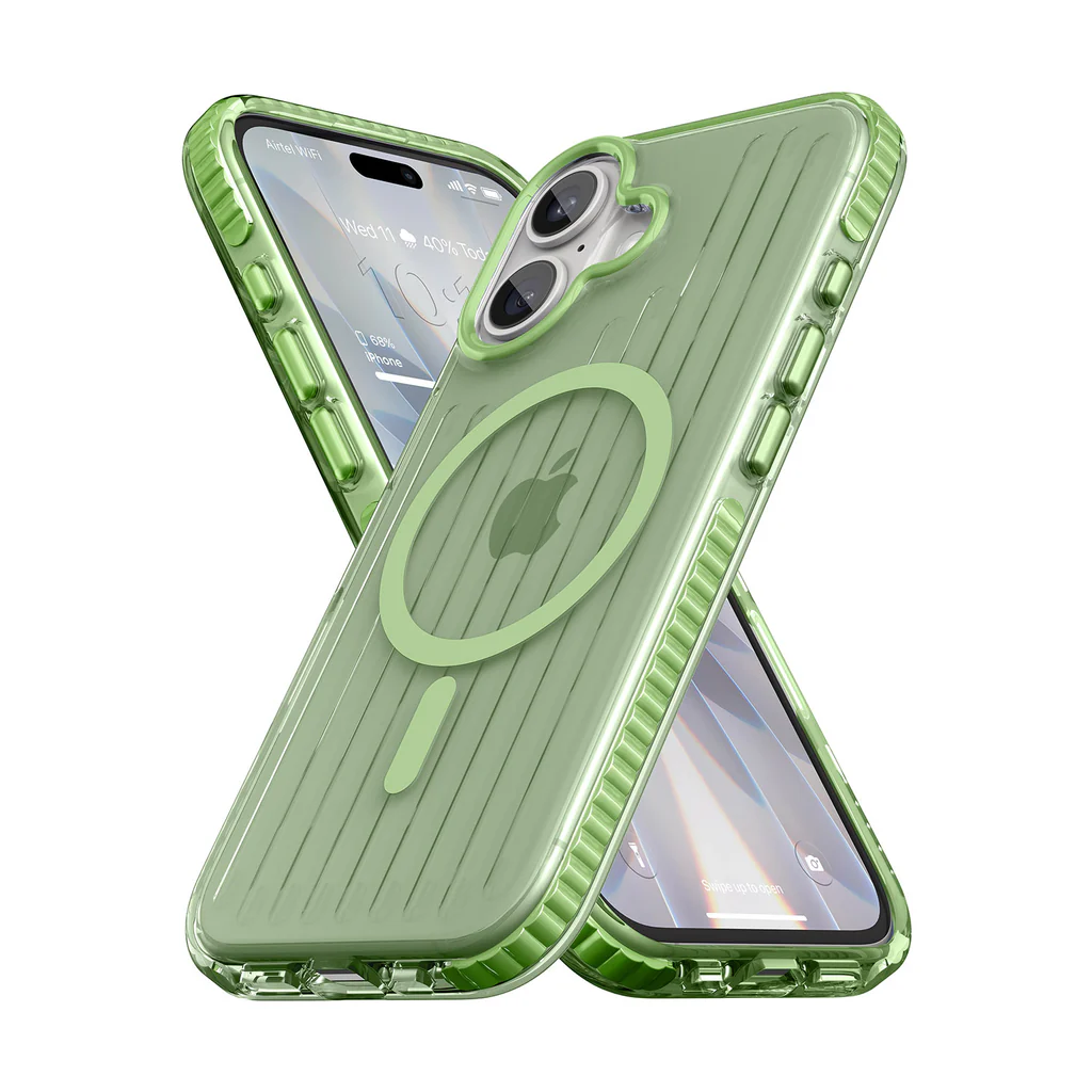 This Vaku Luxos case features a vertical line pattern with a smooth, glossy finish. Its clear design lets your iPhone’s original look shine through while adding a stylish touch.
