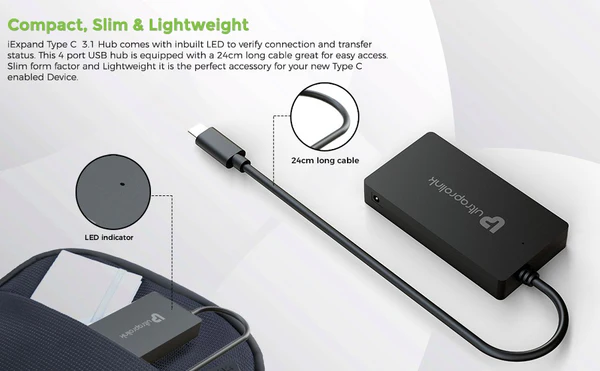 iExpand Type C 3.1 Hub comes with inbuilt LED to verify connection & transfer status. This 4 port USB hub is equipped with a 24cm long cable great for easy access. With Slim form factor & Lightweight it is the perfect accessory for your new Type C enabled Device.