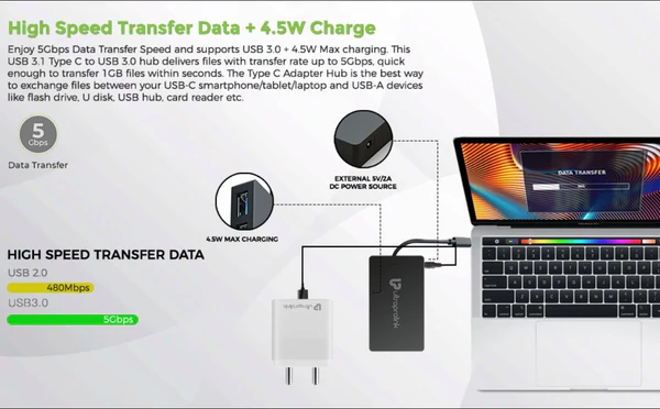 Enjoy 5Gbps Data Transfer Speed & support USB 3.0 + 4.5W Max charging. This USB 3.1 Type C to USB 3.0 hub delivers files with transfer rate up to 5Gbps, quick enough to transfer 1GB files within seconds. The Type C Adapter Hub is the best way to exchange files between your USB-C smartphone/tablet/laptop and USB-A devices like flash drive, U disk, USB hub, card reader etc.