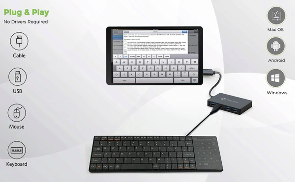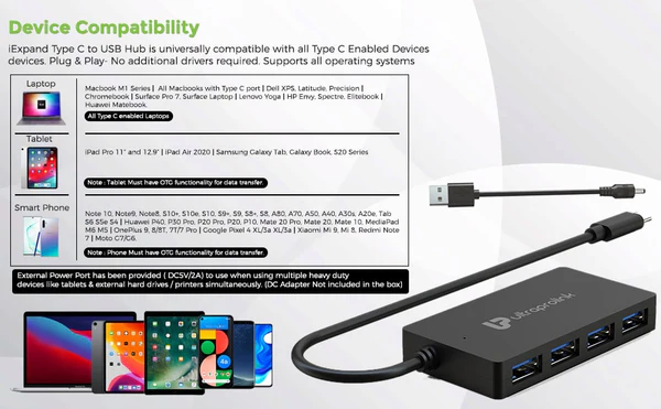 iExpand Type C to USB Hub is Universally Compatible with all Type C Enabled Devices devices. Plug & Play- No additional drivers required. Supports all operating systems – Mac OS, Windows, Linux, Android. Some of the popular devices with Type C are - Macbook M1 Series, All Macbooks with Type C port, Dell XPS, Latitude, Precision, Chromebook, Surface Pro 7, Surface Laptop, Lenovo Yoga, HP Envy, Spectre, Elitebook, Huawei Matebook & all Type C enabled Laptops + iPad Pro 11” & 12.9” / iPad Air 2020 / Samsung Galaxy Tab , Galaxy Book, S20 Series / Note 10 / Note9/ Note8/ S10+/ S10e/S10 /S9+ /S9/S8+ /S8/A80/A70/A50/ A40/ A30s /A20e/Tab S6 S5e S4, Huawei P40 / P30 Pro/P20 Pro/ P20 / P10/Mate 20 Pro/Mate 20/Mate 10/MediaPad M6 M5,OnePlus 9, 8/8T, 7T/7 Pro/,Google Pixel 4 XL/ 3a XL/3a, Xiaomi Mi 9/Mi 8/Redmi Note 7,Moto G7/G6. Note : Phone & Tablet Must have OTG functionality for data transfer.
