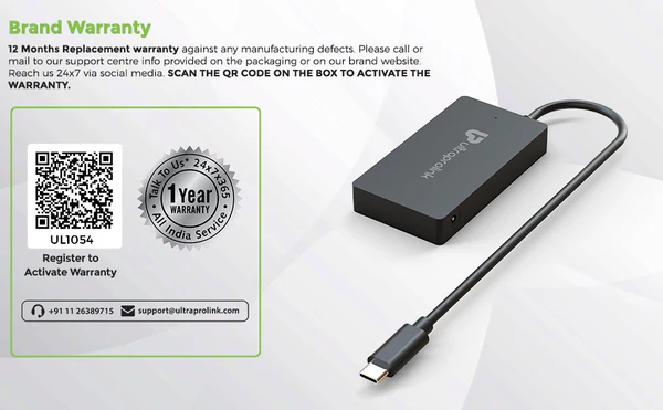 Unleash the potential of your device with UltraProlink UL1054 iExpand – USB Type C 3.1 (Gen 1) to USB 3.0 x 4 port Hub with 5 Gbps Superspeed. Connect up to 4 USB devices / peripherals to your Laptop such as external hard drives, Printers, USB flash drives, mouse, keyboard, USB headphone, card readers, gaming controllers. Don’t feel limited by the absence of enough USB ports on your device. Connect multiple external hard drives simultaneously & power them via the DC port ( charger not included). Enjoy data transfer rates up to 5Gbps - 10X faster than USB 2.0 Hub(480 Mbps), which can transfer HD movies or files in just seconds. Inbuilt LED indicator verifies connection & data transfer status. The 24cms long Cable flexible is perfect for use with desktops which may be kept at a distance. Simply Plug & Play- No Need to install any drivers. When using with Smartphones & Tablets please ensure OTG functionality is available & Turn it on. Note : When connecting multiple devices that require high power like tablets & Hard drives the hub will need external power source 5V/2A .
