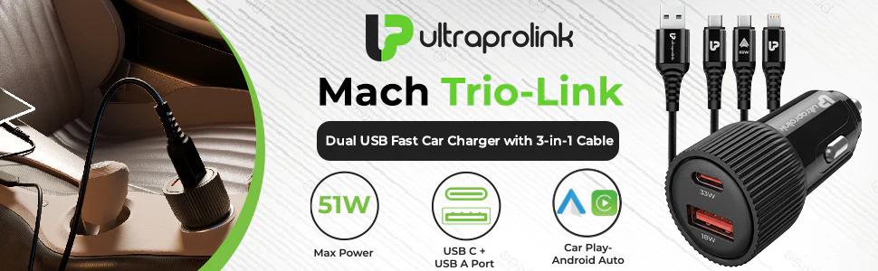 Mach Trio-Link | 51W Dual Port Fast Car Charger with 3-in-1 Cable