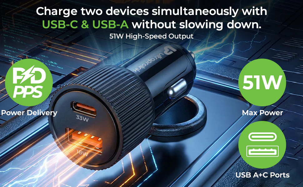 51W Dual-Port Fast Car Charger (USB-C + USB-A) :