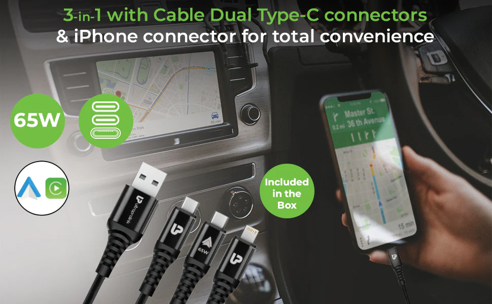 No extra purchases needed. The bundled 3-in-1 cable supports high power up to 65W ( on single Type C) and works for modern devices: Dual Type C connectors for Android phones/tablets, plus an iphone connector. Great for family cars and multi-device users.