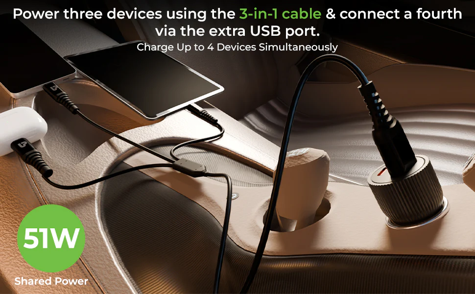 Use the 3-in-1 cable to charge up to three devices simultaneously, and plug a fourth device into the spare USB port. Smart power sharing helps deliver stable charging without hunting for multiple chargers.