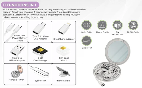 UltraProlink UM1086W 11 in1 Functions Type C-C Cable 65W PD,Type C to Micro USB & iPhone convertors ,USB-A to C Convertor, Phone Stand, Micro SD Cardx2 + Nano Simx2 Storage with Sim Tool, Compact Mirror