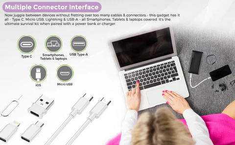 Now juggle between devices without fretting over too many cables & connectors – this gadget has it all - Type C, Micro USB, Lightning & USB-A – all Smartphones, Tablets & laptops covered. It’s the ultimate survival kit when paired with a power bank or charger.