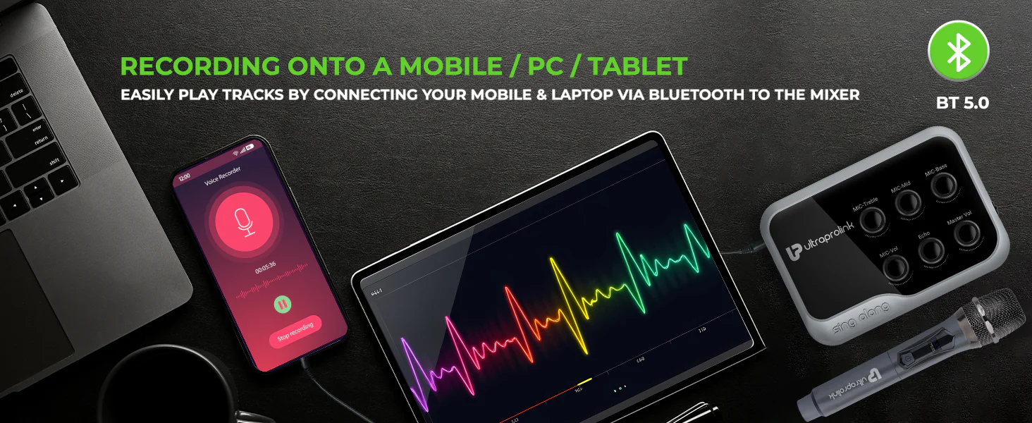 Easily play tracks by connecting your mobile & laptop via Bluetooth to the mixer. Alternatively use the 3.5mm audio cables provided in the box to connect another device to play content from different sources. Connect your mobile device to the mixer interface for karaoke or live broadcasting. Perfect for using with Apps like Tik-Tok, Smule, Youtube, Instagram.