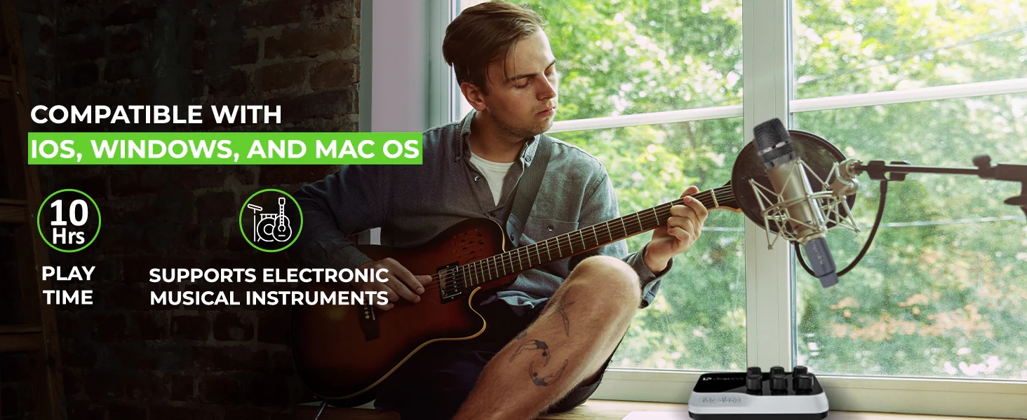 Sing-Along connects easily to iPhones, Android phones, Laptops, PCs & tablets. It works well with all popular operating systems like iOs, Windows & Mac OS. Enjoy up to 10 hours of playtime with the built-in rechargeable battery. Recharge the mixer in 4 hours via the Type C port using the USB-C cable provided in the box.
