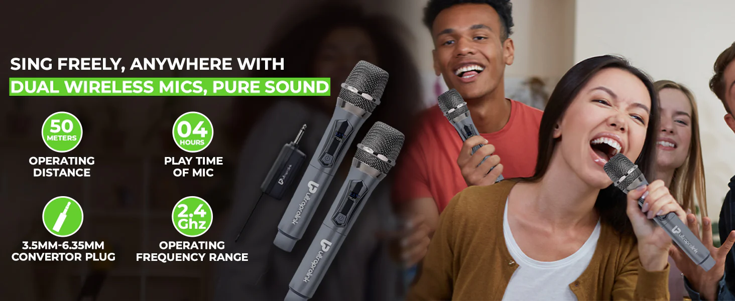 Now Enjoy duets with your partner. Connect the one or two wireless Dynamic microphones via the receiver to the mixer 6.35mm port and use it for karaoke, broadcasting or recording. Two full size professional wireless dynamic microphones along with receiver & accessories have been provided in the box. Each Mic come with a 1200mAh battery ensuring over 8-10 hours time of use time.
