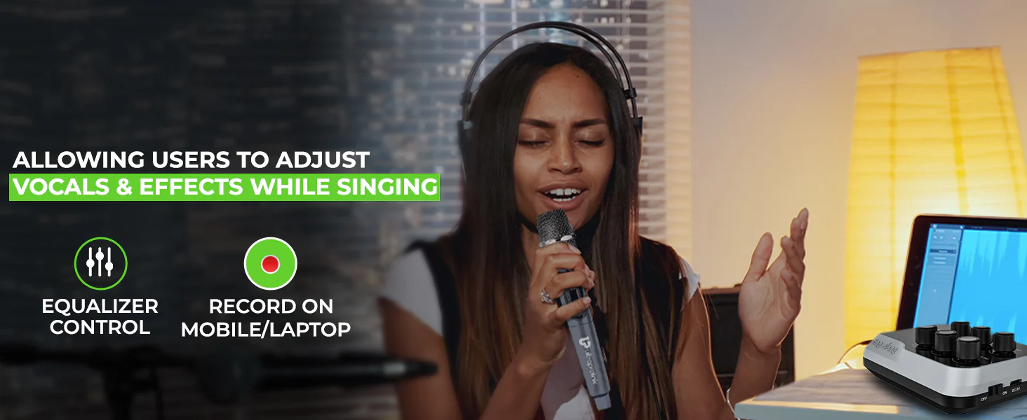 The Sing-Along karaoke mixer now allows recording onto a mobile device or desktop PC. Connect via the REC/LIVE 3.5mm port to your Mobile or use the Type C OTG port to record onto a desktop computer or laptop with inbuilt sound card (no drivers required) & use its inbuilt media player to record. So all content with sound effects can be routed via the mixer & recorded onto your mobile/laptop.