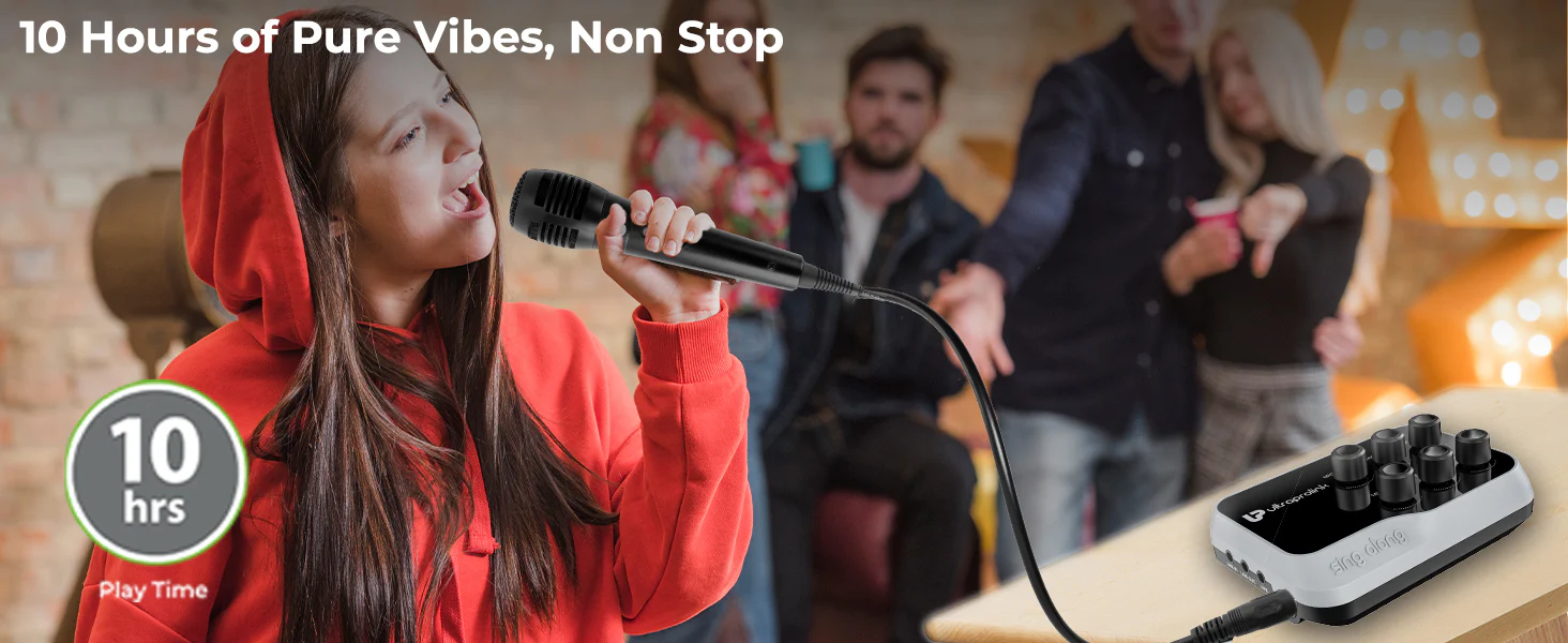 Sing-Along connects easily to iPhones, Android phones, Laptops, PCs & tablets. It works well with all popular operating systems like iOs, Windows & Mac OS. Enjoy up to 10 hours of playtime with the built-in rechargeable battery. Recharge the mixer in 4 hours via the Type C port using the USB-C cable provided in the box.