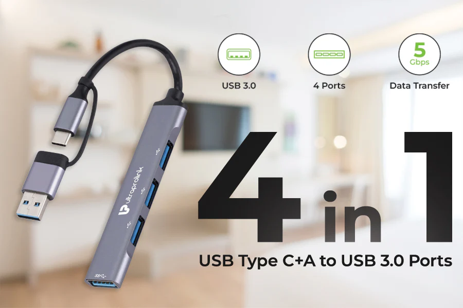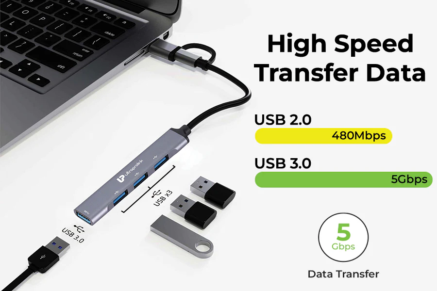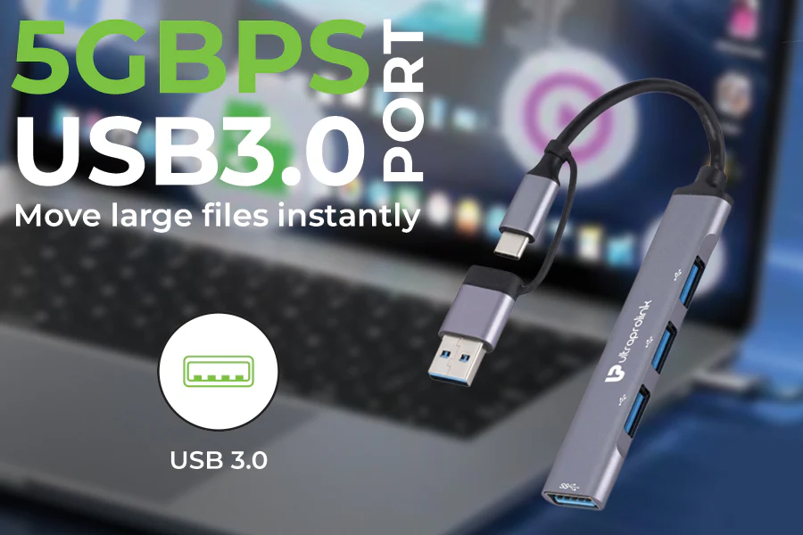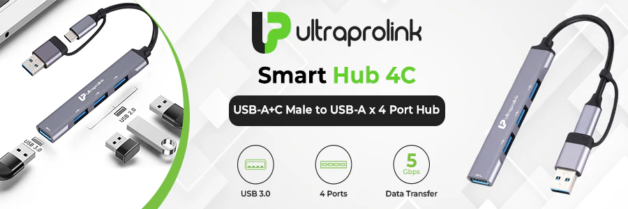 Unleash the potential of your device with UltraProlink UL1205 Slimport 4C – USB Type C+A to USB x 4 port Hub with 5 Gbps Superspeed. Connect up to 4 USB devices / peripherals to your Laptop such as external hard drives, Printers, USB flash drives, mouse, keyboard, USB headphone, card readers, gaming controllers. Don’t feel limited by the absence of enough USB ports on your device. Via the USB 3.0 port, enjoy data transfer rates up to 5Gbps & the 3 USB 2.0 Hub at 480 Mbps, which can transfer HD movies or files in just seconds. The 12cms long Cable flexible is perfect for use with desktops which may be kept at a distance. Simply Plug & Play- No Need to install any drivers. When using with Smartphones & Tablets please ensure OTG functionality is available & Turn it on.