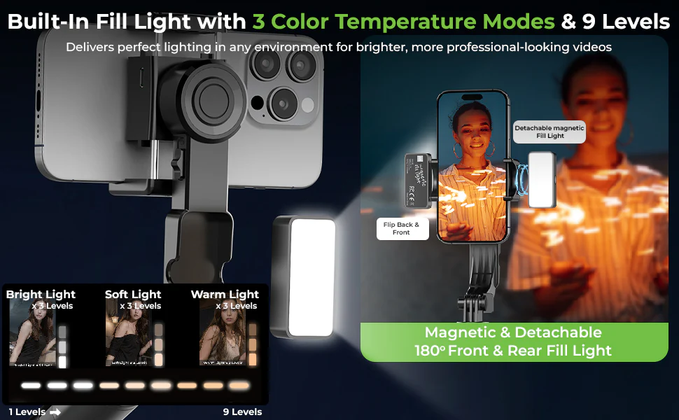 Detachable magnetic Fill Light with 9 Color Temperature Modes :