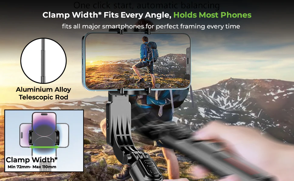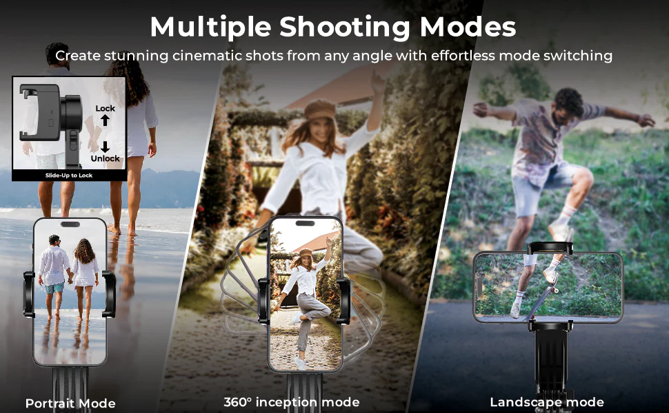 Easily switch between landscape, portrait, and 360° inception modes with one lock button. This multifunctional mobile gimbal ensures cinematic results for YouTube, Instagram Reels, and TikTok videos.