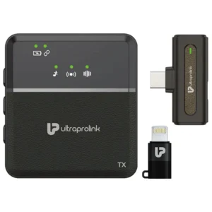 The UltraProlink Sonic Pro UM1192-1 Wireless Microphone & Receiver Set is designed for superior audio quality in any recording setting. Featuring a professional collar mic with a clip-on design and easy plug & play receiver, setup is hassle-free. The universal Type C connector and Type C to iPhone converter plug ensure compatibility with both Android and iOS devices. Tip: Turn on the OTG function when using this product with Android phones.The 360° omnidirectional mic with active noise reduction, mute, and echo functions delivers professional-quality audio for live streaming, vlogs, podcasts, YouTuber kits, Facebook Live, Insta Live, and TikTok. The rechargeable mic offers 12 hours of continuous use and a 15-day standby time, with a 3.5mm port for earphone monitoring and controller voice prompts. Tip: Use the 3P Open Camera APP if your device doesn’t support mic recording. Operating on a 2.4GHz band with a 20m/65ft range in clear line of sight, it works without Bluetooth and has low power consumption. The set includes 1 mic, 1 receiver, 1 converter plug, USB cable, manual, and a 12-month