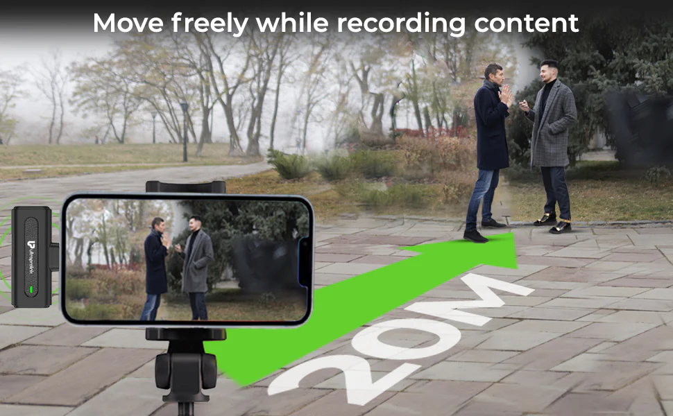 Operates on a 2.4GHz band with a 20m/65ft range in clear line of sight, providing stable signal transmission without obstacles. Works without Bluetooth and with low power consumption, making it ideal for on-the-go recording.
