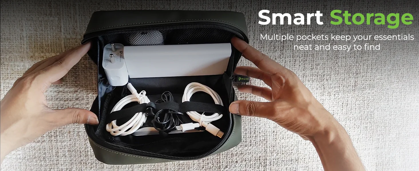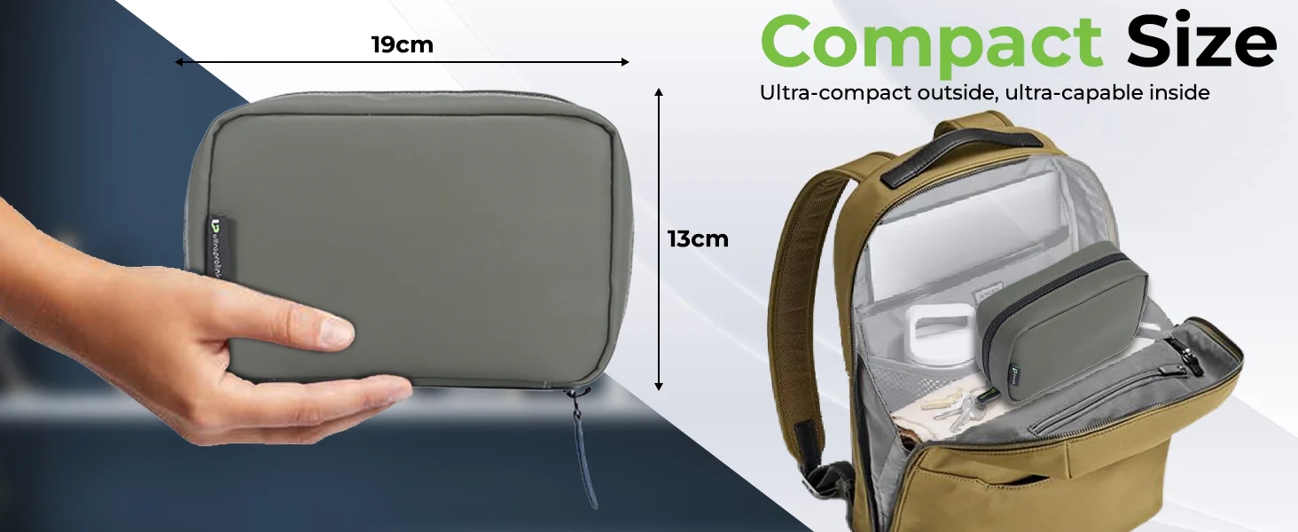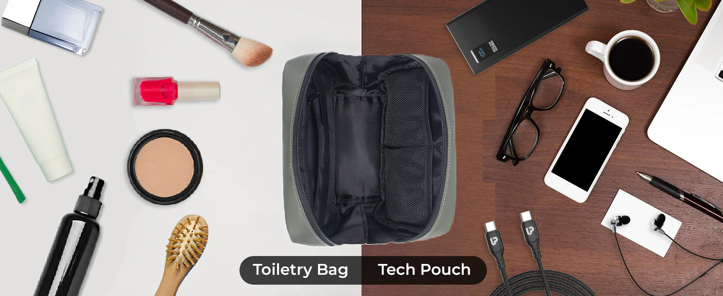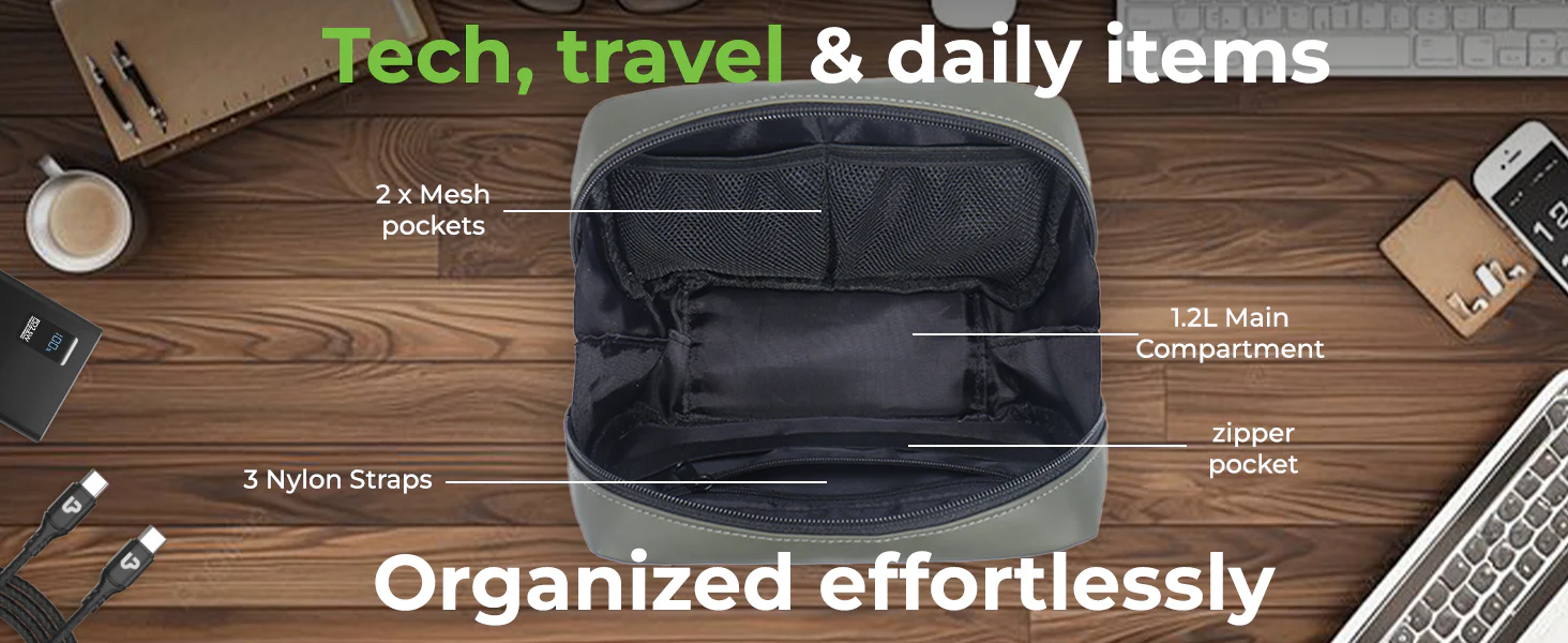 Holds accessories like chargers, cables, keys, and pens, adapting to daily and travel needs like toiletries. Can even double up as a day bag for ladies cosmetics.