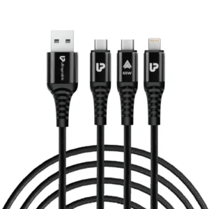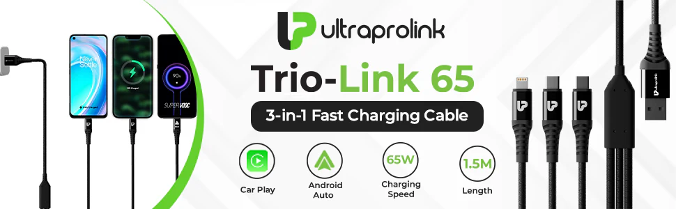 UltraProlink TrioLink 65W 3 in 1 fast charging cable for a rapid charge experience. With its high capability of charging several devices comfortably at the same time when traveling, at home, or at the workplace, the 3-in-1 Charging Cable offers the user a fresh, innovative, and high-quality charging experience. This product is equipped with an iPhone connector and 2 Type C connectors compatible with almost any device and is specifically designed and dedicated for charging. The cable is braided with premium nylon fibre which lasts longer than common rubber or textile coating. Its tough outer flexible design offers the user a tangle-free experience. You now have access to a quick, dependable, and convenient source of very fast charging on the road thanks to this new versatile, portable, and resourceful solution.