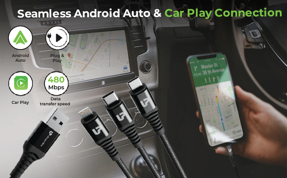 Enjoy uninterrupted connectivity in your car. This 3-in-1 charging cable seamlessly supports Android Auto and CarPlay, ensuring smooth navigation, music, and calls while your device charges.