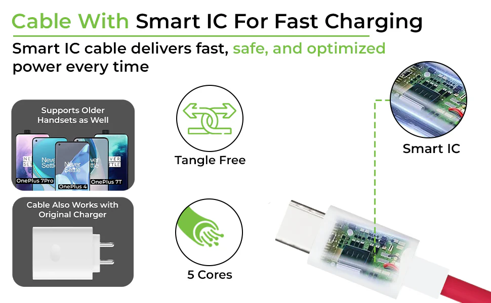 This fast charging cables comes with built in Smart IC that detects the connected device and delivers the optimal charging speed for maximum efficiency. It also steps up or steps down the power as per the requirements of the connected device. The USB-C connector is embedded with an IC to ensure perfect handshake between the phone & charger & also to ensure it works with the original chargers. This IC also ensures the cable works with original brand chargers..
