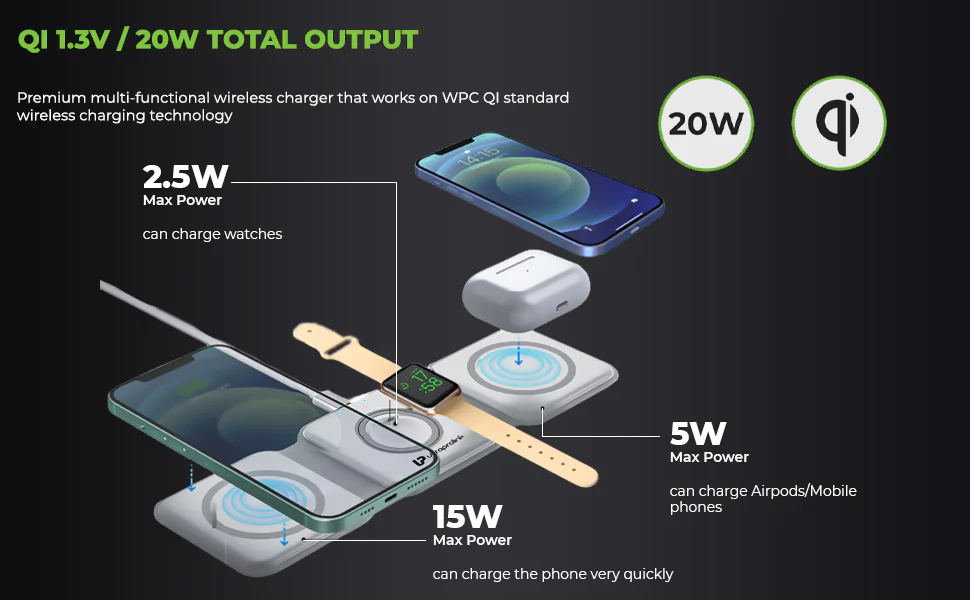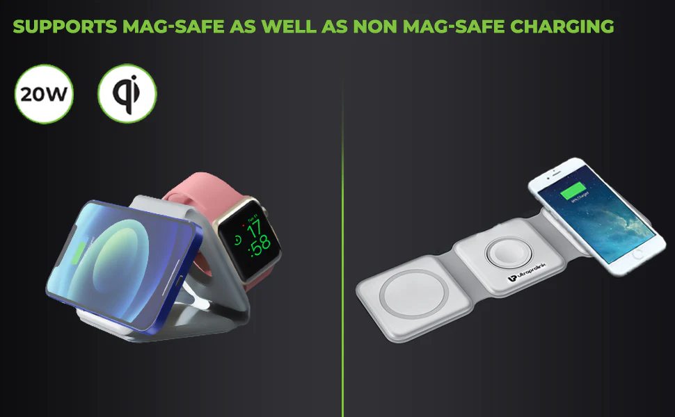 It is compatible with all Qi-enabled Phones including Magsafe® enabled iPhones. Supports all Qi compatible Smartphones such as iPhone® 8/8 plus, X, XS, XR,XS Max, 11, 11 Pro,11 Pro Max, Samsung Galaxy S22 Ultra, Google Pixel 6 Pro, Samsung Galaxy Z Fold 3, OnePlus 9 Pro. Magsafe supports – iPhone®12 Series,13 Series,14 Series.Airpods® Generation 2/3,Pro,iWatch Ultra, iWatch Series 8,Watch Series 7, Watch series SE, Watch Series 6/5/4/3/2.