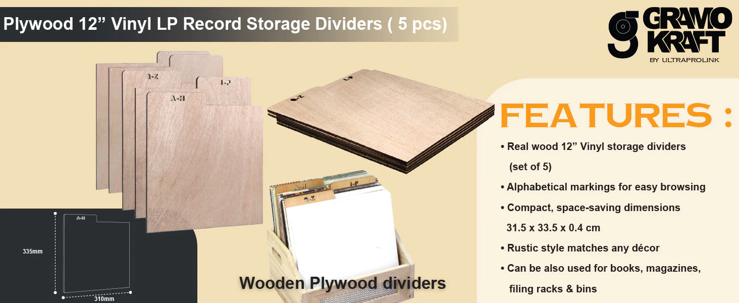 Give your vinyl record collection, magazines, files or other media the organization and display they deserve with the ULTRAPROLINK GRAMOKRAFT Alphabetical Dividers Organizer. Crafted in a robust plywood build measuring 31.5 x 33.5 x 0.4 cm, these storage box dividers feature A-Z labelled slots making it effortless to sort and browse through your LPs, records, magazines or office files. Designed for both function and style, the natural wood finish and clean lines make it an elegant fit for any home décor, study or music room. Use these on racks, bins, shelves, desks or next to your stereo console for direct access to your collection. With multifunctional capabilities, these dividers serve as a vinyl record, CD, Books, magazine organiser or file crate. Bring style, structure and easy browsing to your collection with the ULTRAPROLINK GRAMOKRAFT dividers — the smart choice for audiophiles, collectors and home-office users alike.
