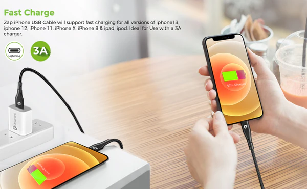 Zap iPhone USB Cable will support fast charging for all versions of iphone13,iphone 12,iPhone 11,iPhone X,iPhone 8 & ipad,ipod.Ideal for Use with a 2.4A charger.