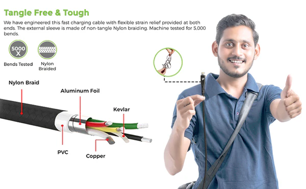 We have engineered this fast charging cable with flexible strain relief provided at both ends. The external sleeve is made of non-tangle Nylon braiding. Machine tested for 5,000 bends. Double-sided USB connectors with flexible strain relief are designed for frequent insertions. Micro USB Cable with Aluminium housing, high-purity copper wire, triple-shielding will keep long-lasting fast charging performance.