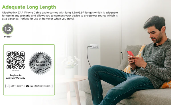 UltraProlink ZAP iPhone Cable cable comes with long 1.2m/3.9ft length which is adequate for use in any scenario and allows you to connect your device to any power source which is at a distance. Perfect for use at home or when you travel.