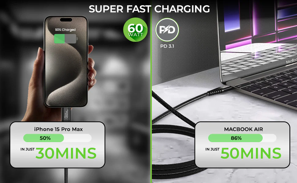This UltraProlink Zoom PD 60 USB C to C cable delivers fast charging up to 20V-3A for laptops, phones, and pads, including iPhone 15/14/13, Galaxy S23, and Google Pixel. Experience rapid power boost with PD 3.1 technology.